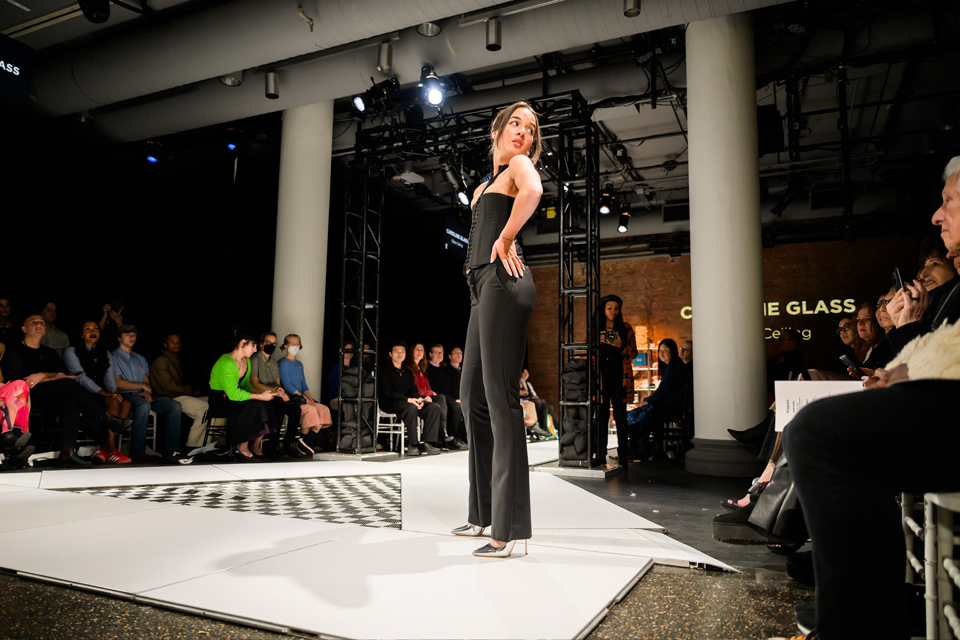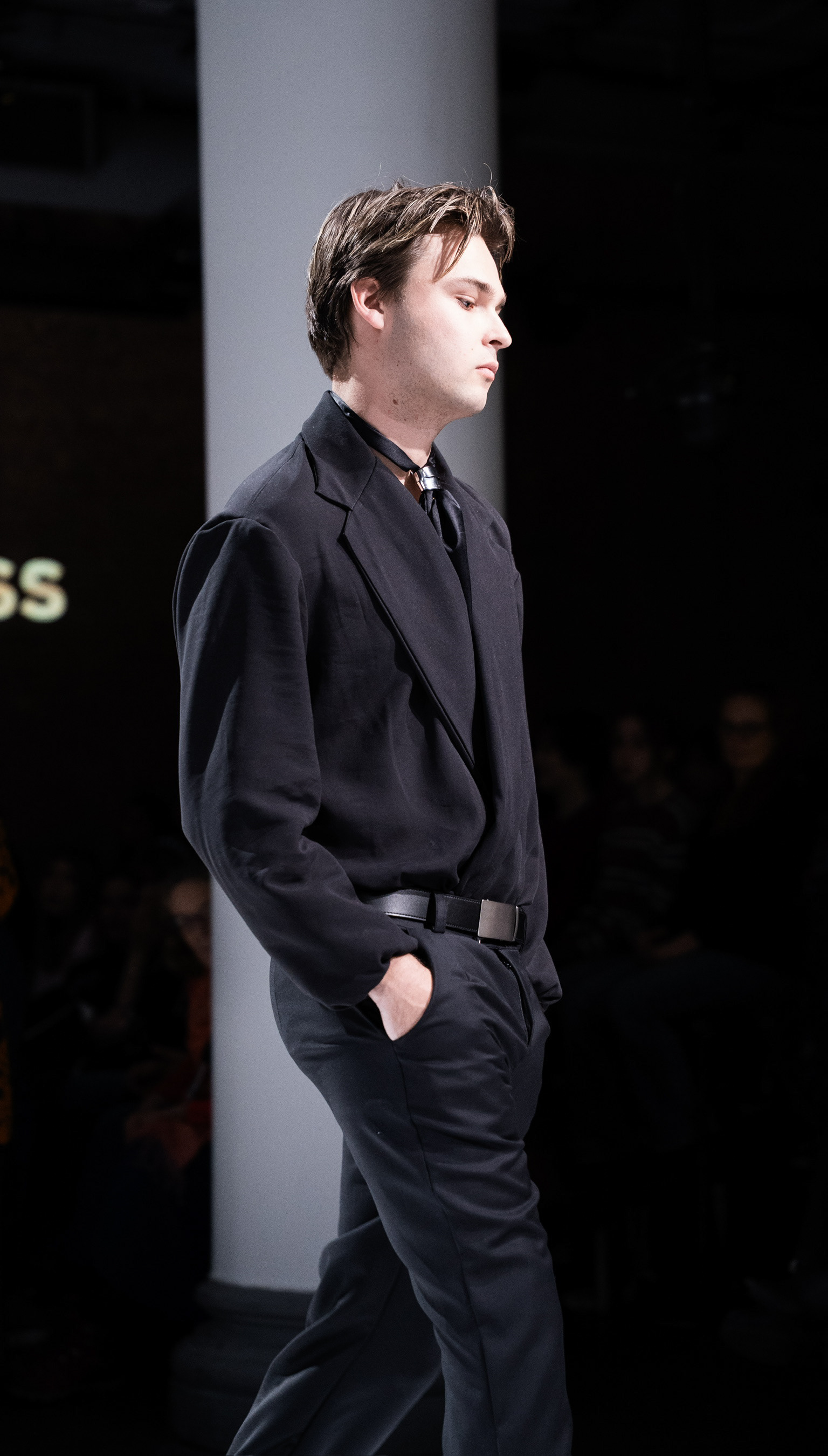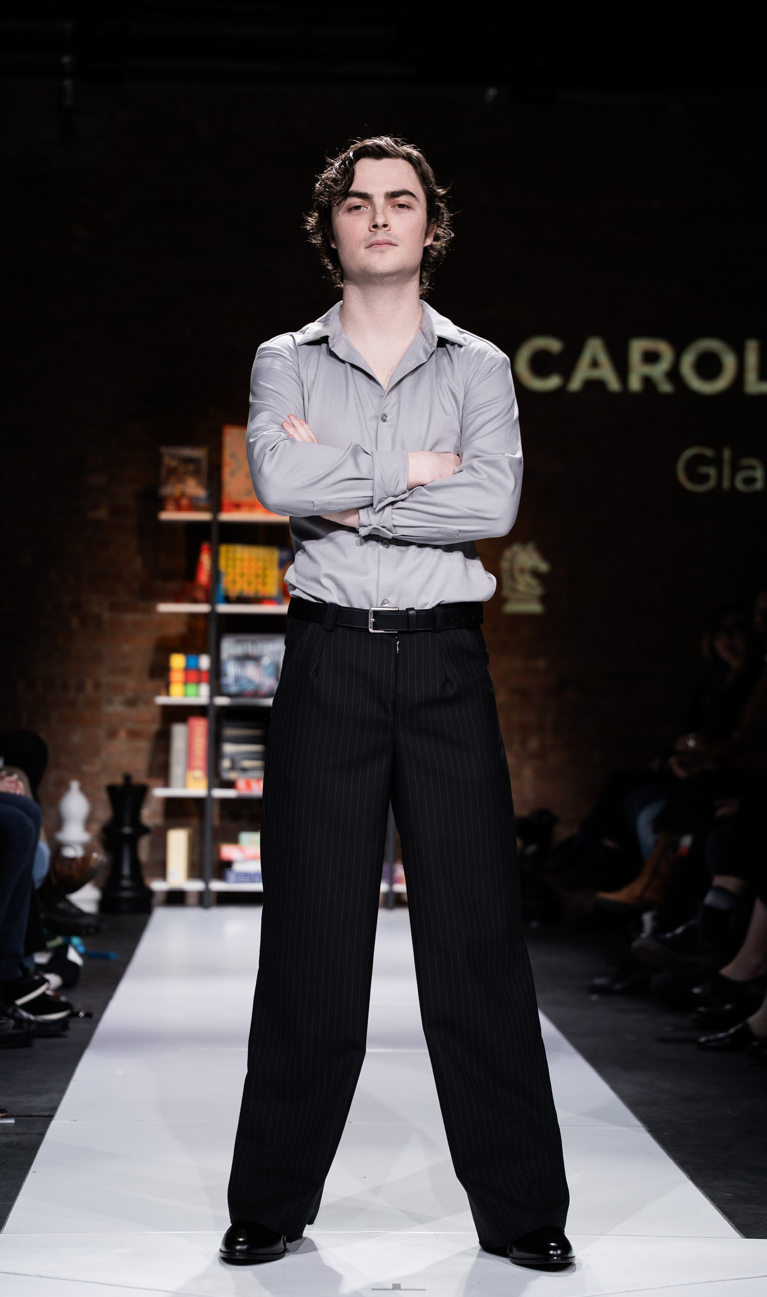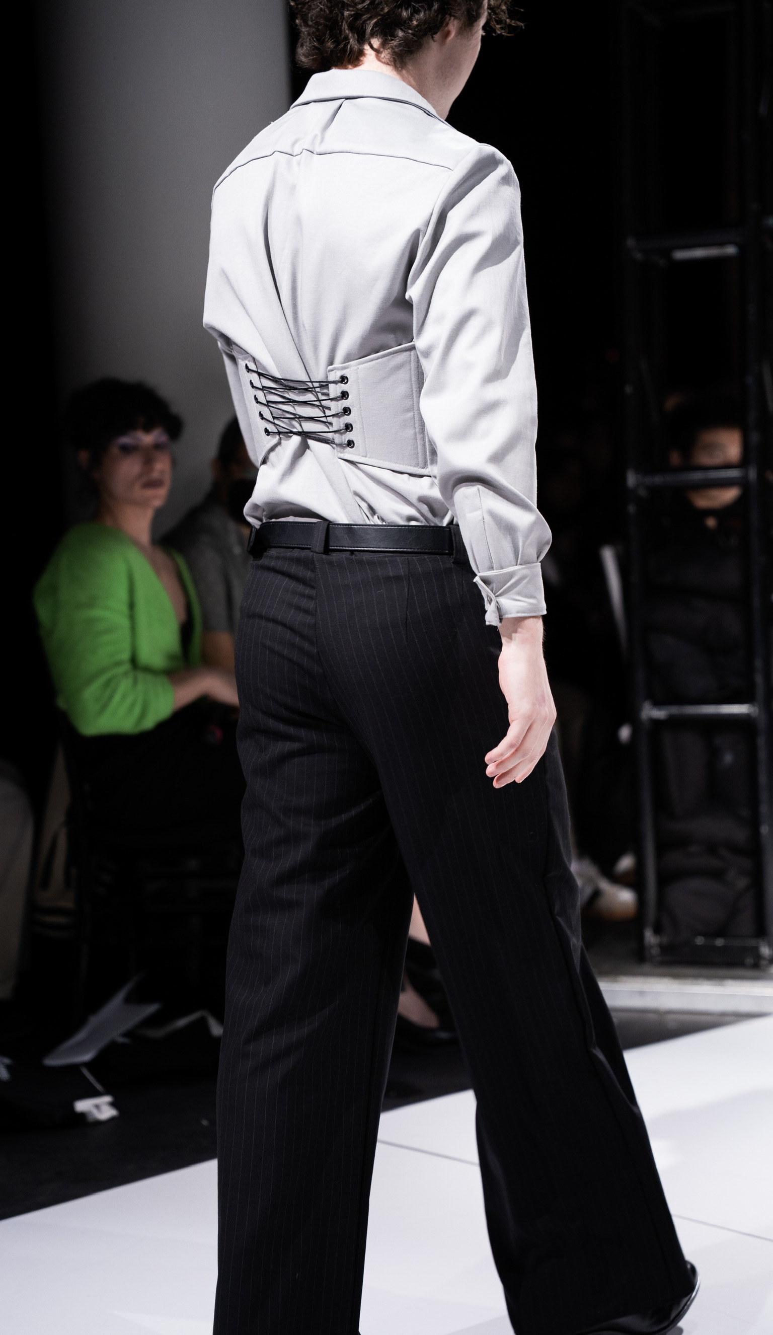 “Glass Ceiling” is both a critique and a conversation, posing the question: How do we navigate a system that demands conformity, yet promises success? This collection aims to place a spotlight on the psychological and emotional conditions that are inherent in high-pressure, demanding environments, such as Wall Street. The garments are predominately constructed from wool and silk textiles that are traditionally associated with corporate America. Coupled with a more reserved palette consisting primarily of dark solids and pinstripes, this collection echoes the refined yet repressive spirit of corporate culture. Rigid components used in this collection, such as fan corseting, high necklines, and structured silhouettes, serve as metaphors for the restrictive and authority driven demands often associated with these environments. The juxtaposition of elegance to restriction in these garments illustrates the dynamic relationship between aspiration and limitation. Each look in this collection provokes the audience to think deeply about the psychological mind games that have historically shaped the corporate experience.