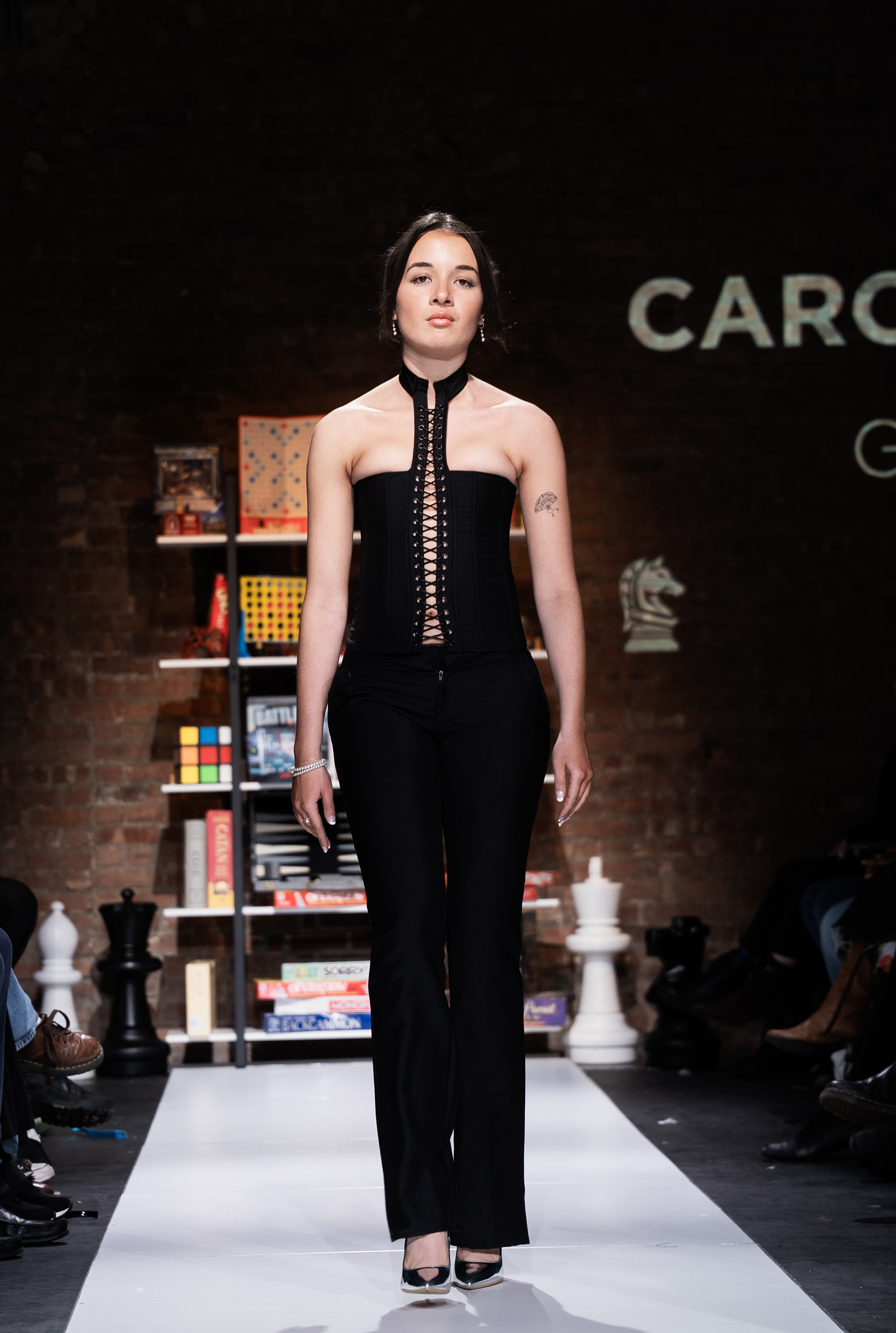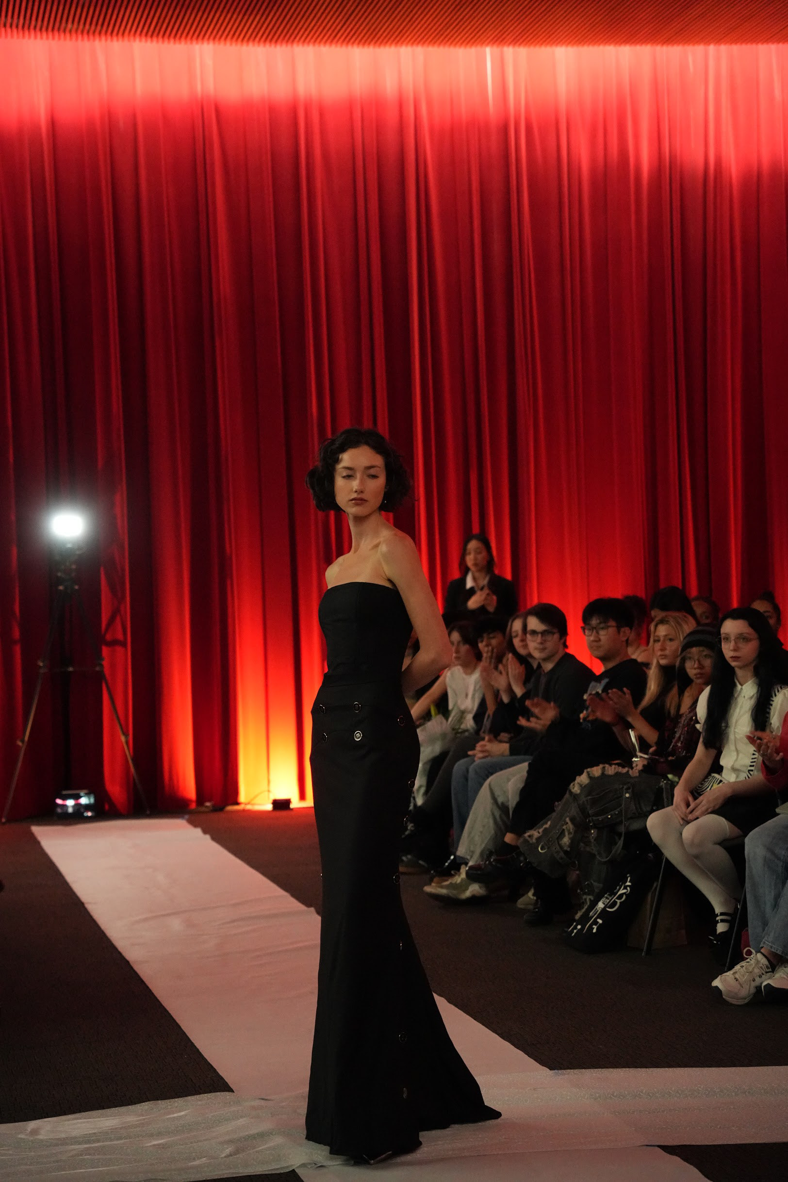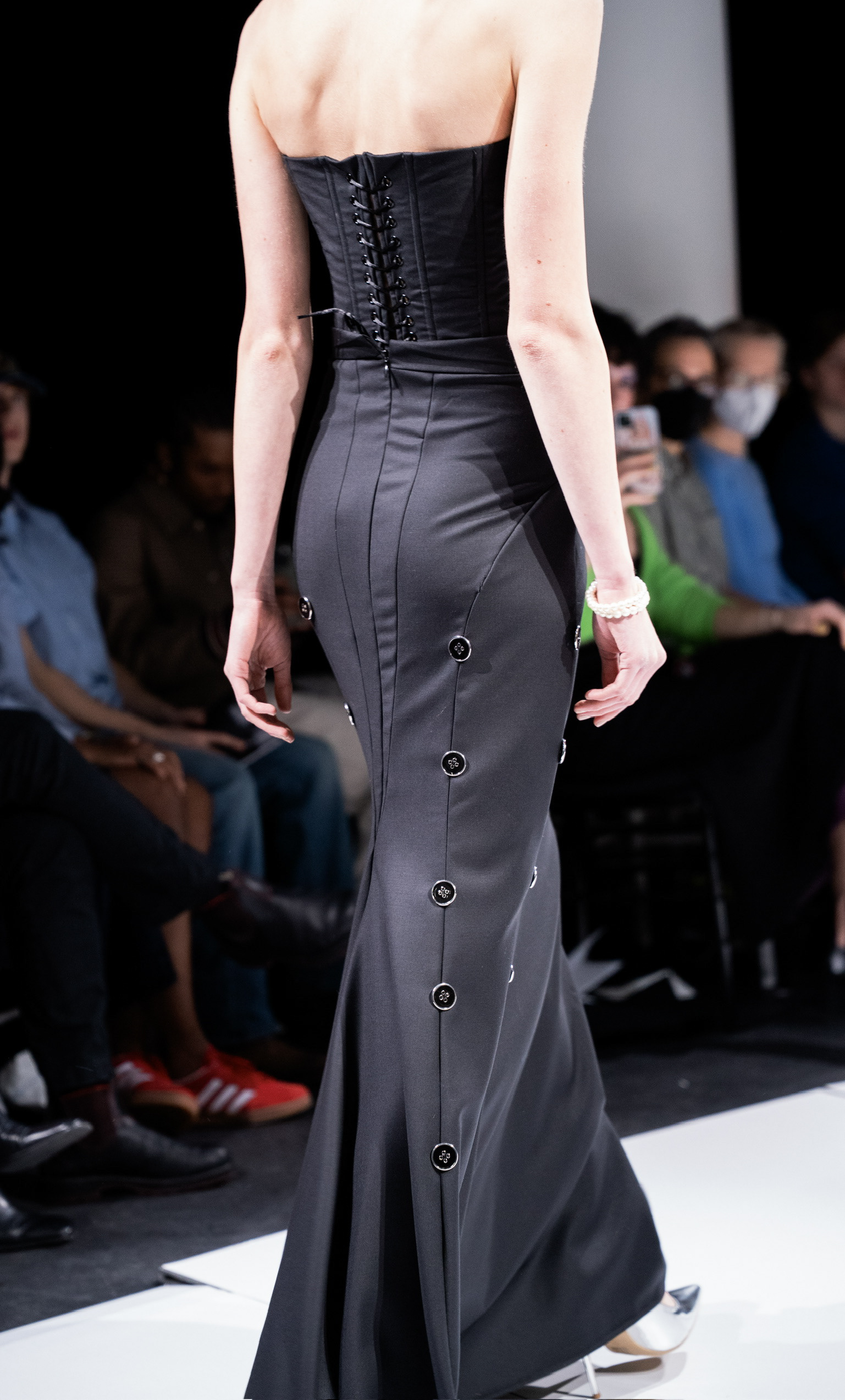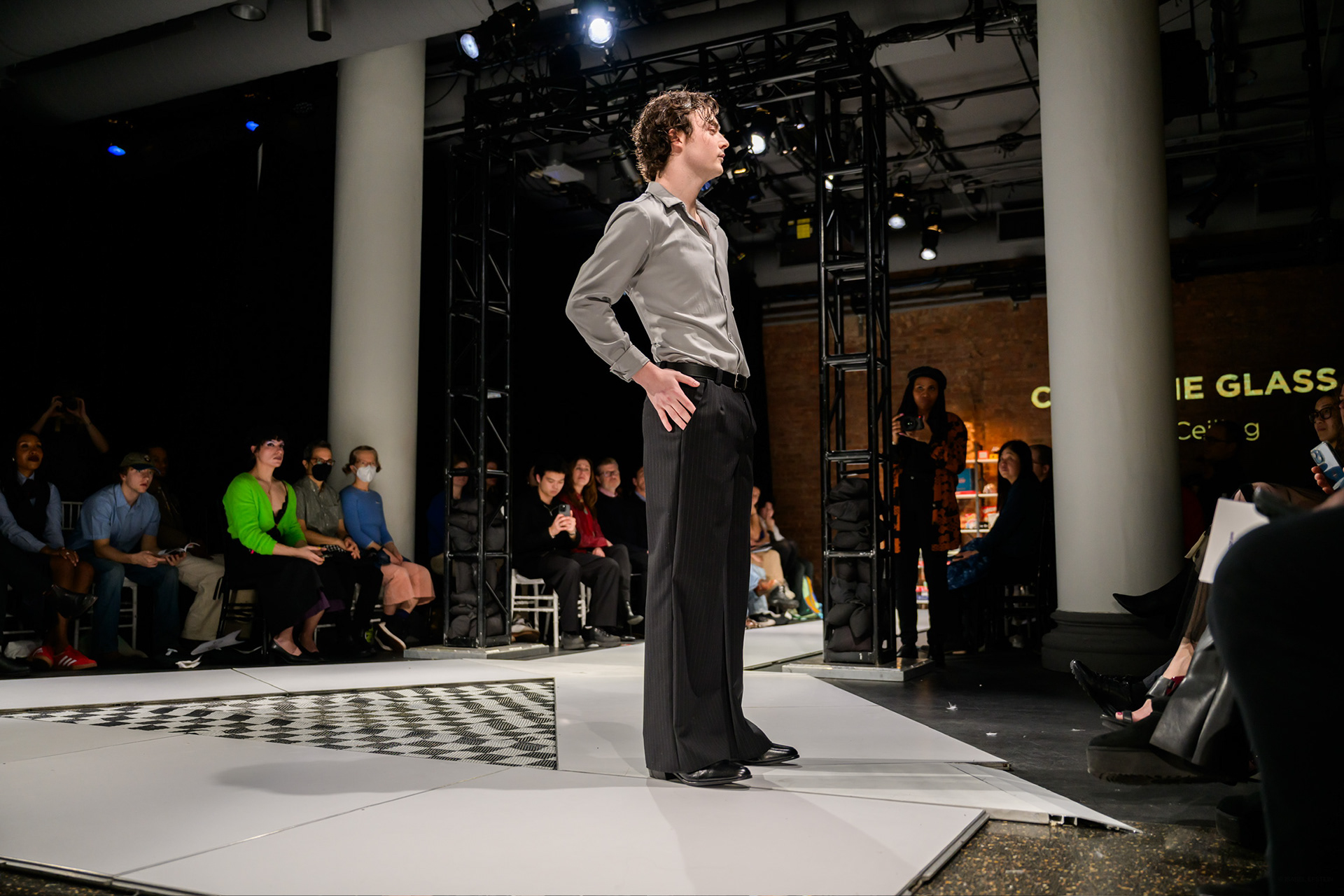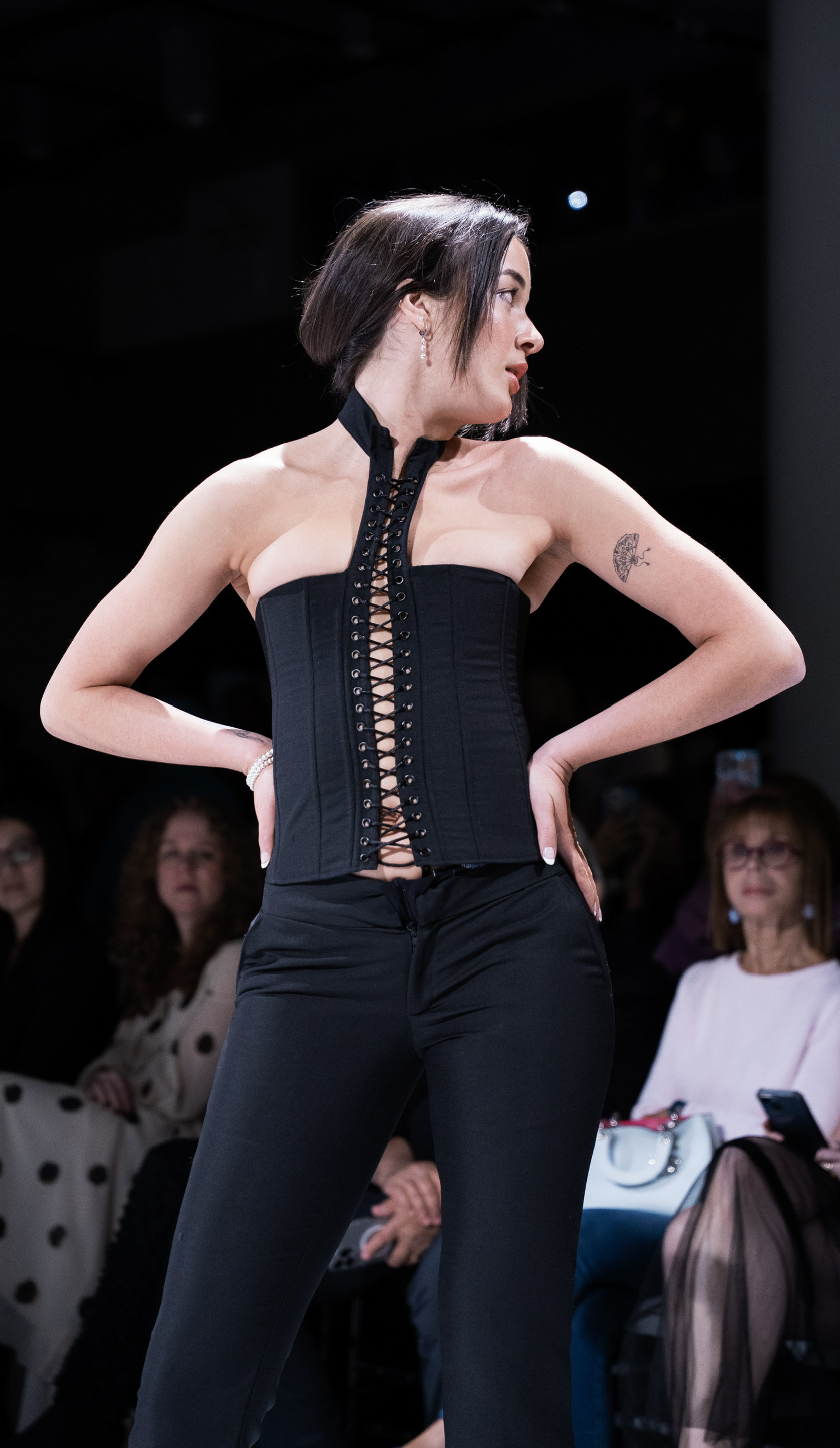 “Glass Ceiling” is both a critique and a conversation, posing the question: How do we navigate a system that demands conformity, yet promises success? This collection aims to place a spotlight on the psychological and emotional conditions that are inherent in high-pressure, demanding environments, such as Wall Street. The garments are predominately constructed from wool and silk textiles that are traditionally associated with corporate America. Coupled with a more reserved palette consisting primarily of dark solids and pinstripes, this collection echoes the refined yet repressive spirit of corporate culture. Rigid components used in this collection, such as fan corseting, high necklines, and structured silhouettes, serve as metaphors for the restrictive and authority driven demands often associated with these environments. The juxtaposition of elegance to restriction in these garments illustrates the dynamic relationship between aspiration and limitation. Each look in this collection provokes the audience to think deeply about the psychological mind games that have historically shaped the corporate experience.