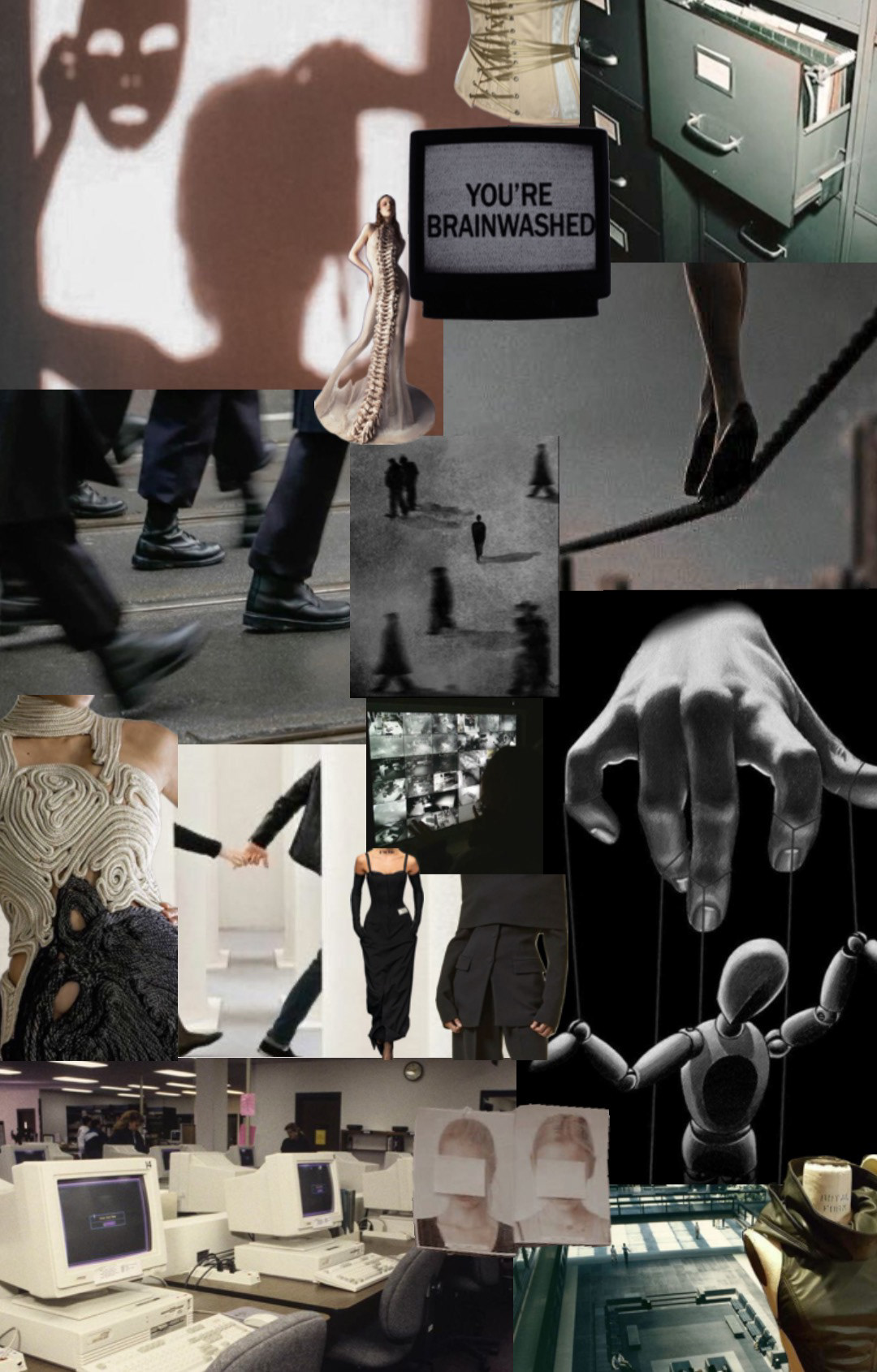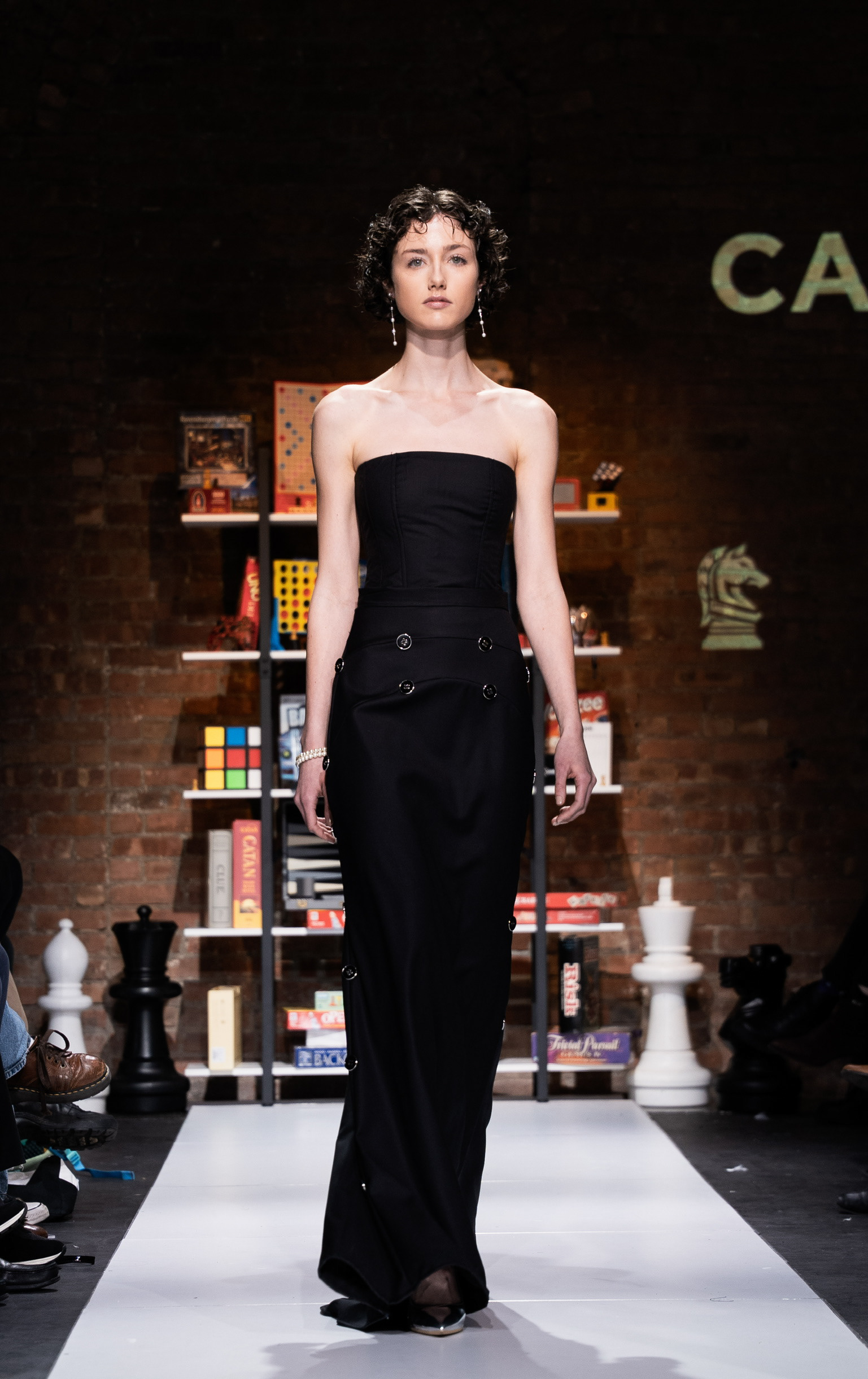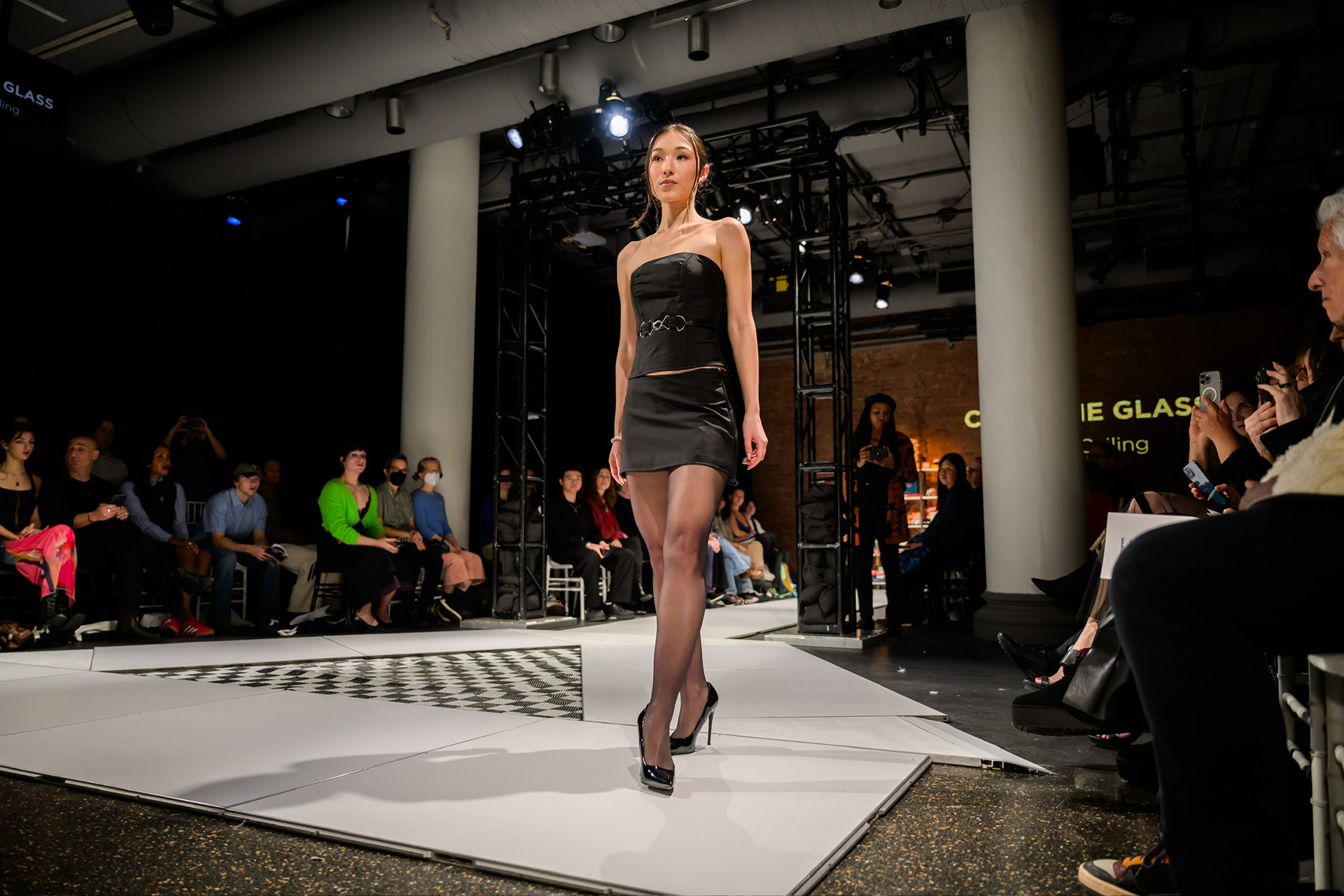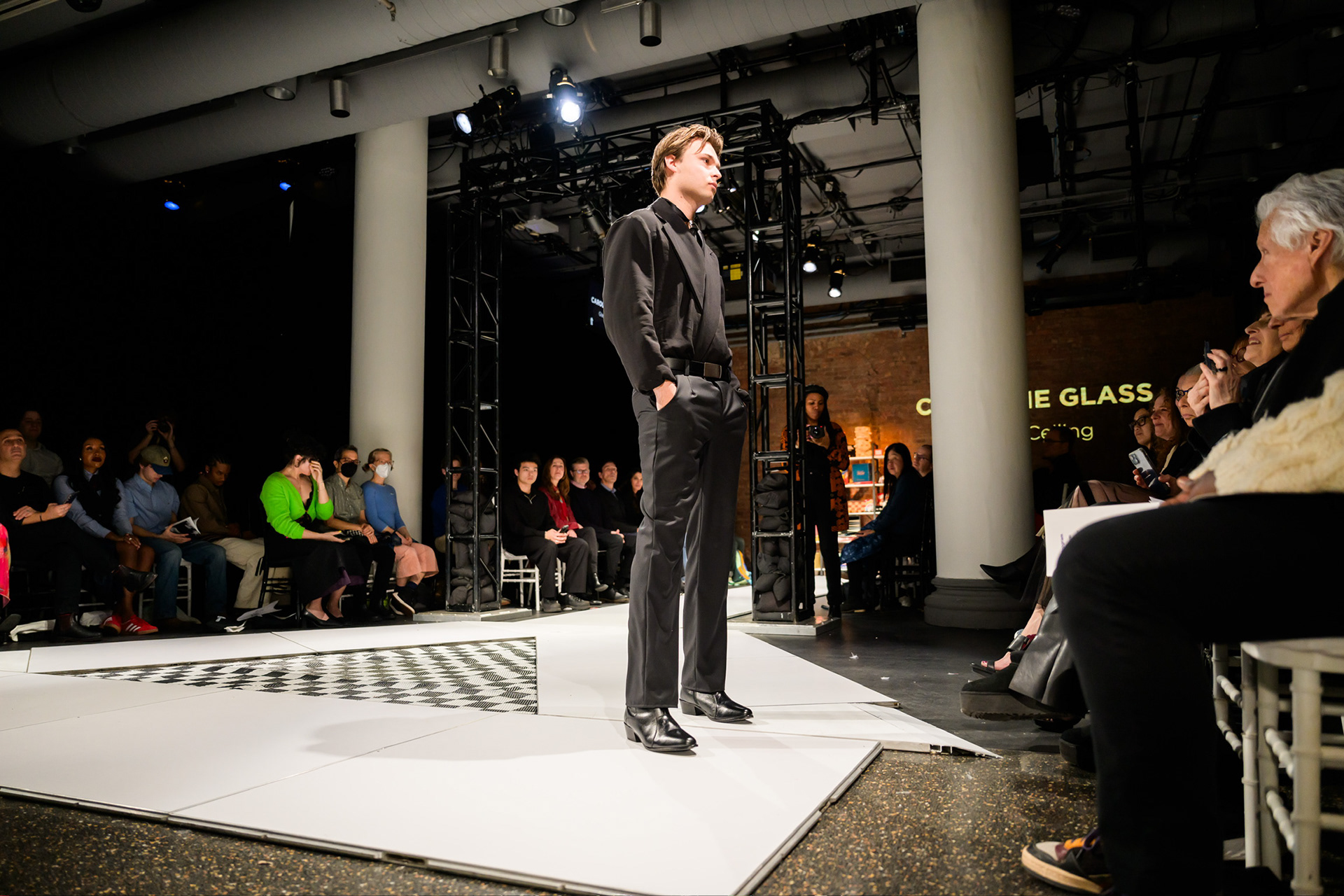“Glass Ceiling” is both a critique and a conversation, posing the question: How do we navigate a system that demands conformity, yet promises success? This collection aims to place a spotlight on the psychological and emotional conditions that are inherent in high-pressure, demanding environments, such as Wall Street. The garments are predominately constructed from wool and silk textiles that are traditionally associated with corporate America. Coupled with a more reserved palette consisting primarily of dark solids and pinstripes, this collection echoes the refined yet repressive spirit of corporate culture. Rigid components used in this collection, such as fan corseting, high necklines, and structured silhouettes, serve as metaphors for the restrictive and authority driven demands often associated with these environments. The juxtaposition of elegance to restriction in these garments illustrates the dynamic relationship between aspiration and limitation. Each look in this collection provokes the audience to think deeply about the psychological mind games that have historically shaped the corporate experience.