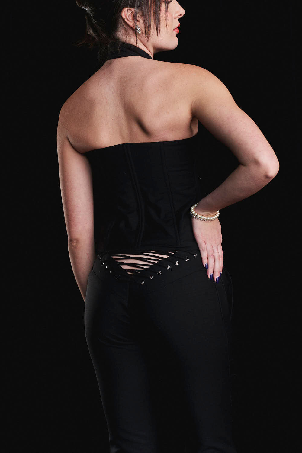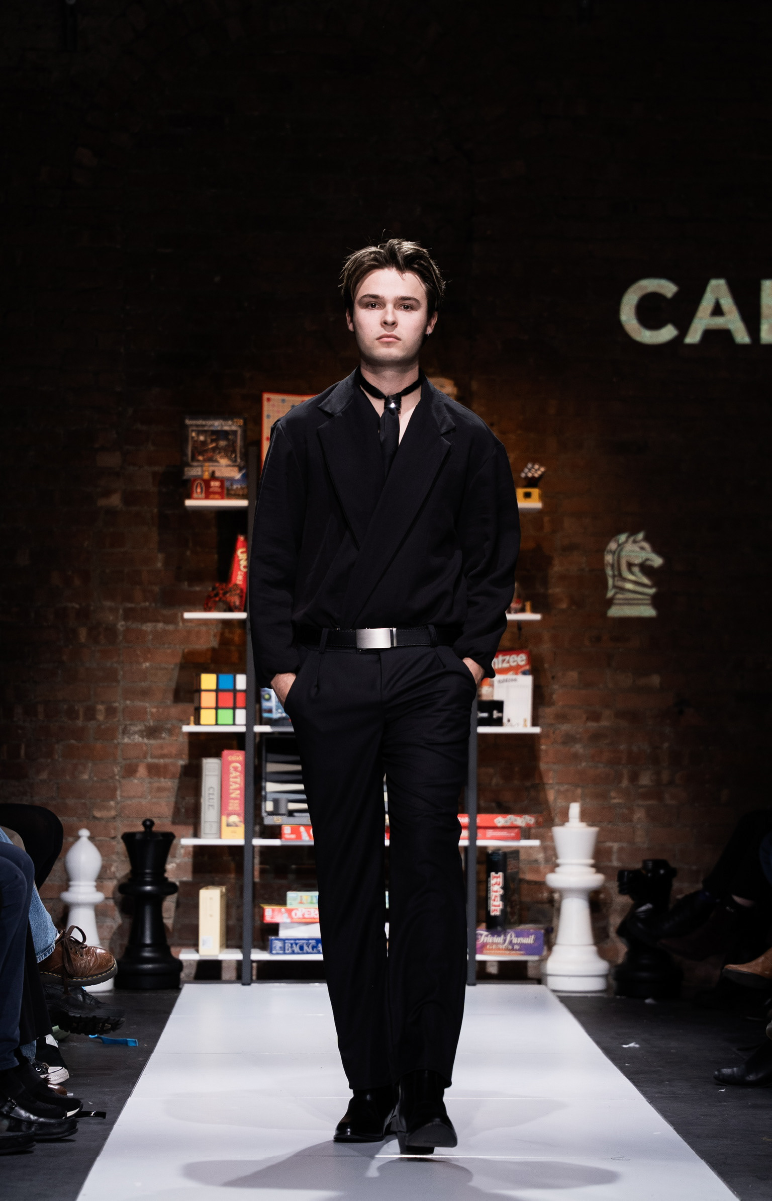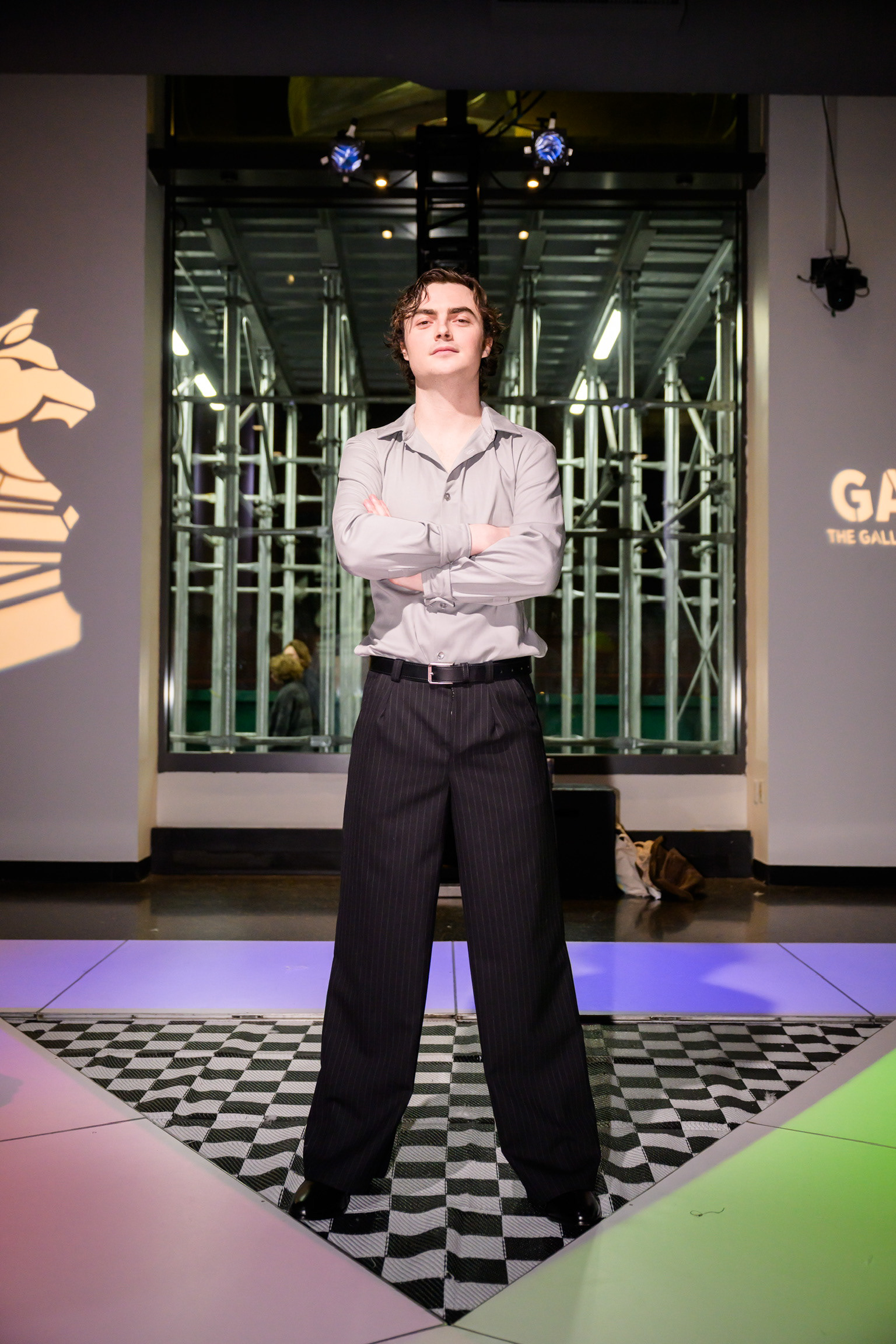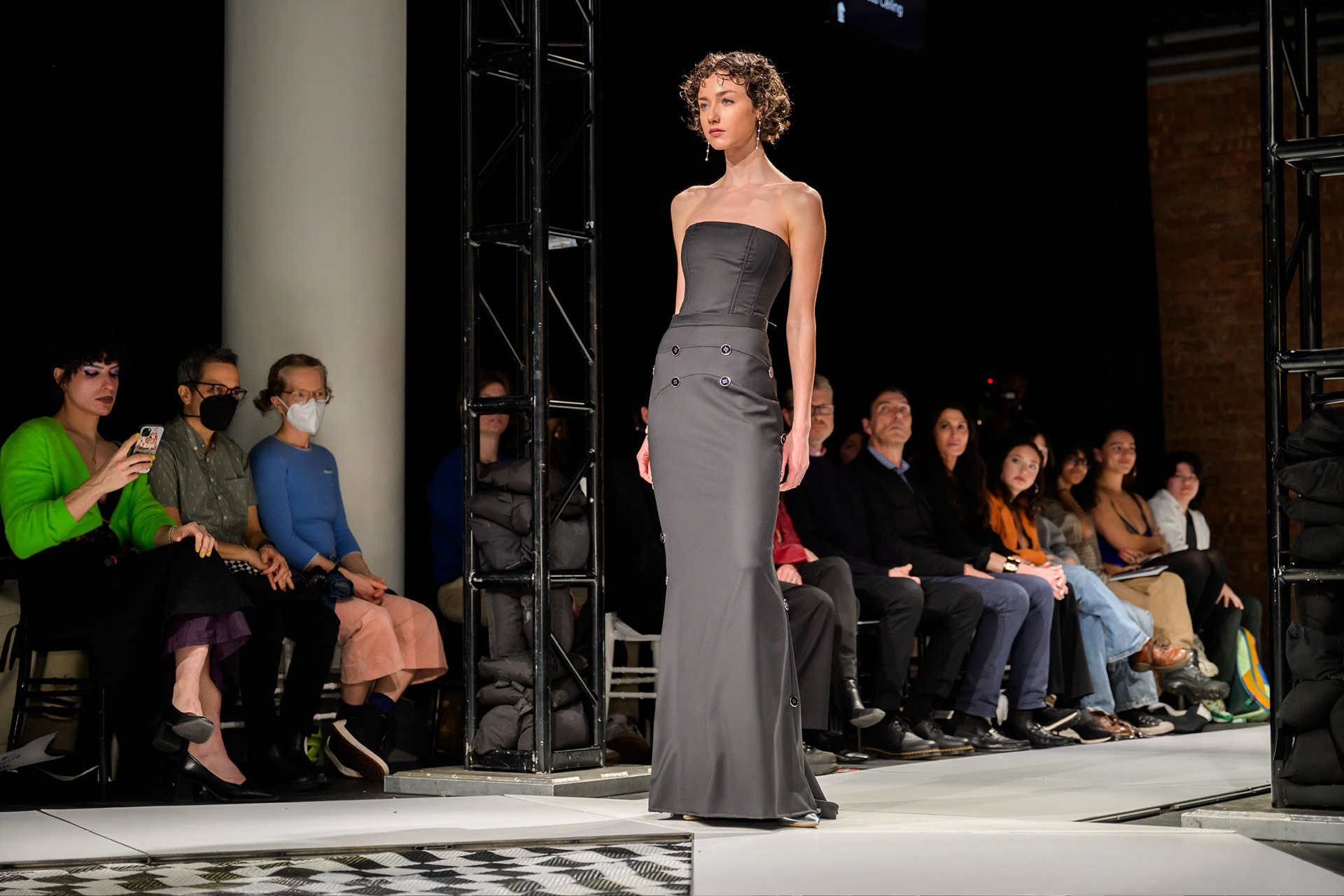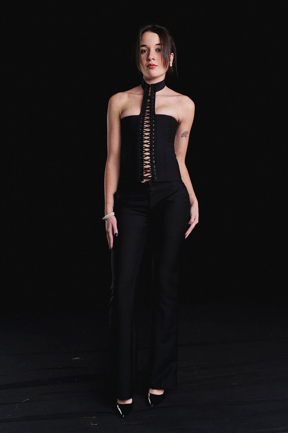 “Glass Ceiling” is both a critique and a conversation, posing the question: How do we navigate a system that demands conformity, yet promises success? This collection aims to place a spotlight on the psychological and emotional conditions that are inherent in high-pressure, demanding environments, such as Wall Street. The garments are predominately constructed from wool and silk textiles that are traditionally associated with corporate America. Coupled with a more reserved palette consisting primarily of dark solids and pinstripes, this collection echoes the refined yet repressive spirit of corporate culture. Rigid components used in this collection, such as fan corseting, high necklines, and structured silhouettes, serve as metaphors for the restrictive and authority driven demands often associated with these environments. The juxtaposition of elegance to restriction in these garments illustrates the dynamic relationship between aspiration and limitation. Each look in this collection provokes the audience to think deeply about the psychological mind games that have historically shaped the corporate experience.